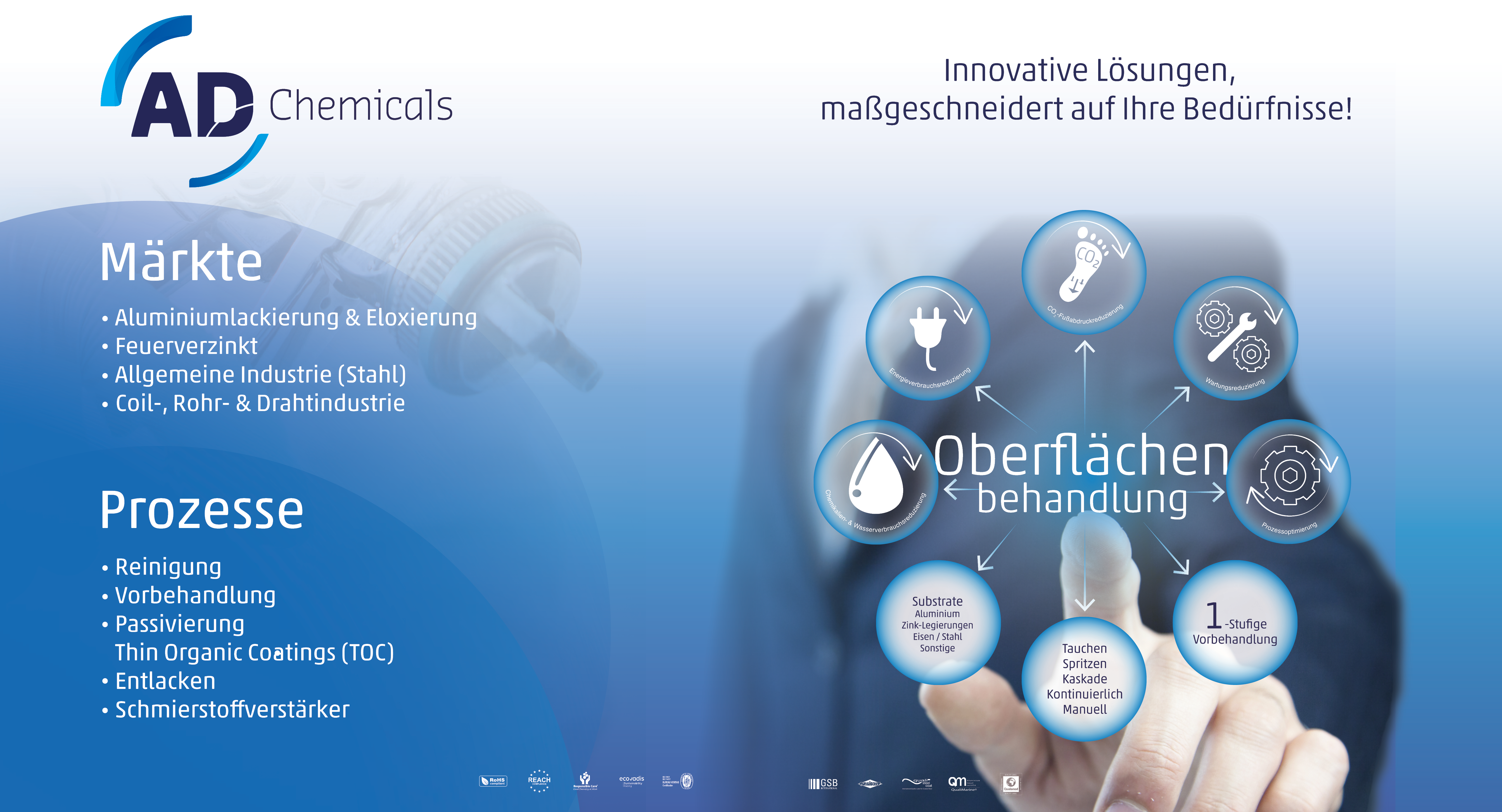 AD steht für Advanced Development. Als Teil der AD International ist AD Chemicals GmbH spezialisiert auf die chemische Oberflächenbehandlung von Metallen. Unsere Lösungen kommen weltweit bei Pulverbeschichtung, Nasslackierung und Feuerverzinkung zum Einsatz – geeignet für Aluminium, verzinkten Stahl, Stahl und Multi-Metall.