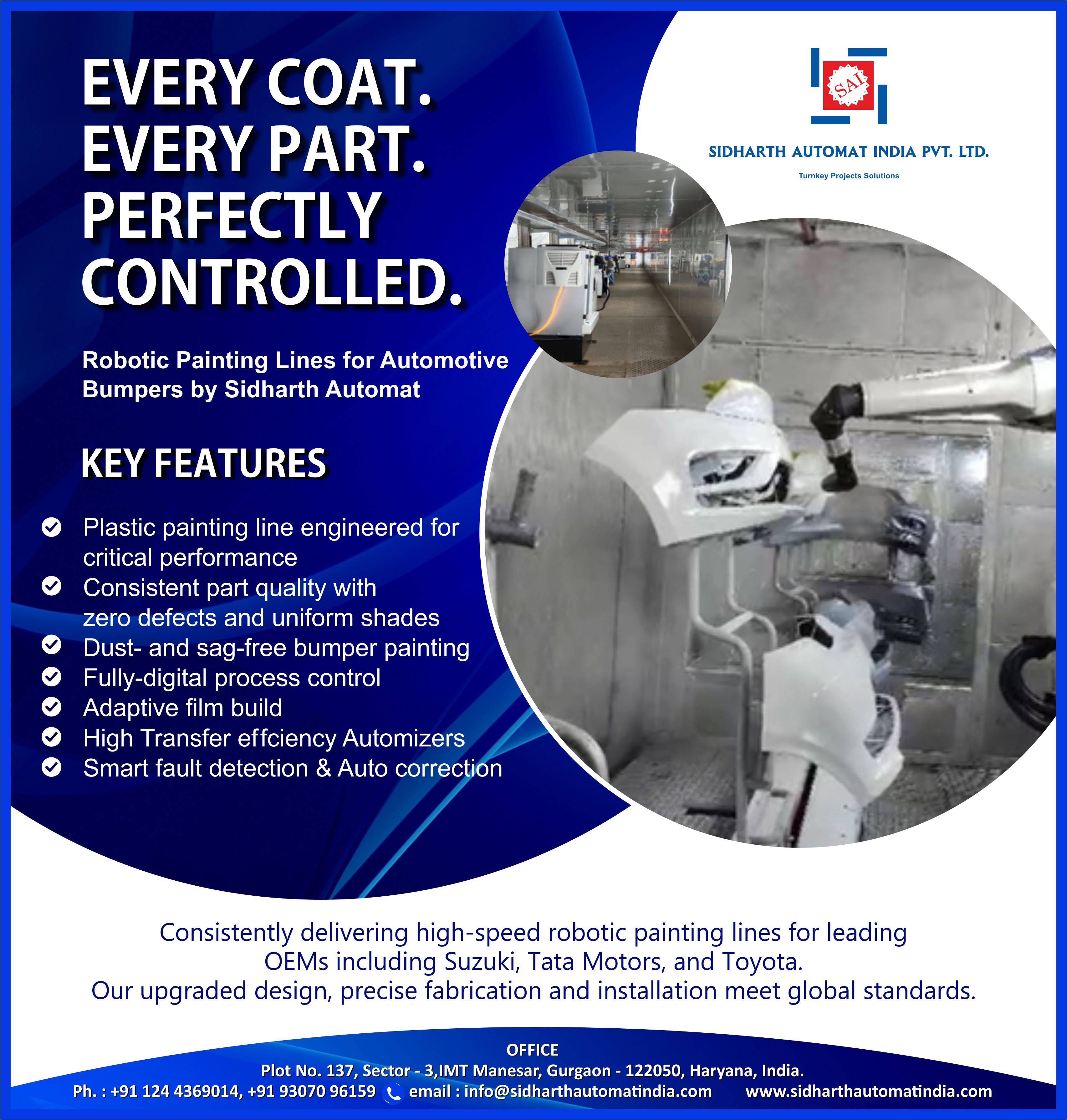 Sidharth Automat India Pvt. Ltd. is a leading turnkey supplier of sustainable “green” paint shop solutions, delivering advanced systems for automotive and industrial applications. With over 200 skilled professionals and strong in-house manufacturing capabilities, the company specializes in PT-CED lines, robotic top coat systems, dry booths, electric ovens, and energy-efficient utilities. Focused on reducing carbon footprint, Sidharth integrates technologies like heat pumps, EC fans, and low-emission processes, enabling up to 40–50% energy and emission reduction. Backed by proven execution and trusted by leading OEMs, Sidharth Automat is driving the transition towards zero-pollution, future-ready paint shops