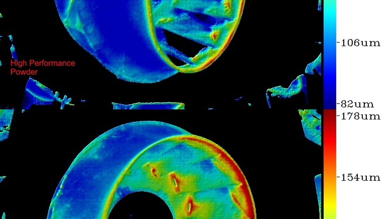 Der überwiegende Anteil liegt im Bereich von 80 µm (blaue Färbung); lediglich in äußersten Randbereichen treten höhere Schichtdicken auf (grün, gelb und orange). Damit eröffnet sich für Sie ein bislang verborgenes Potenzial, Pulver gezielt dort einzusparen, wo es technisch nicht erforderlich ist.