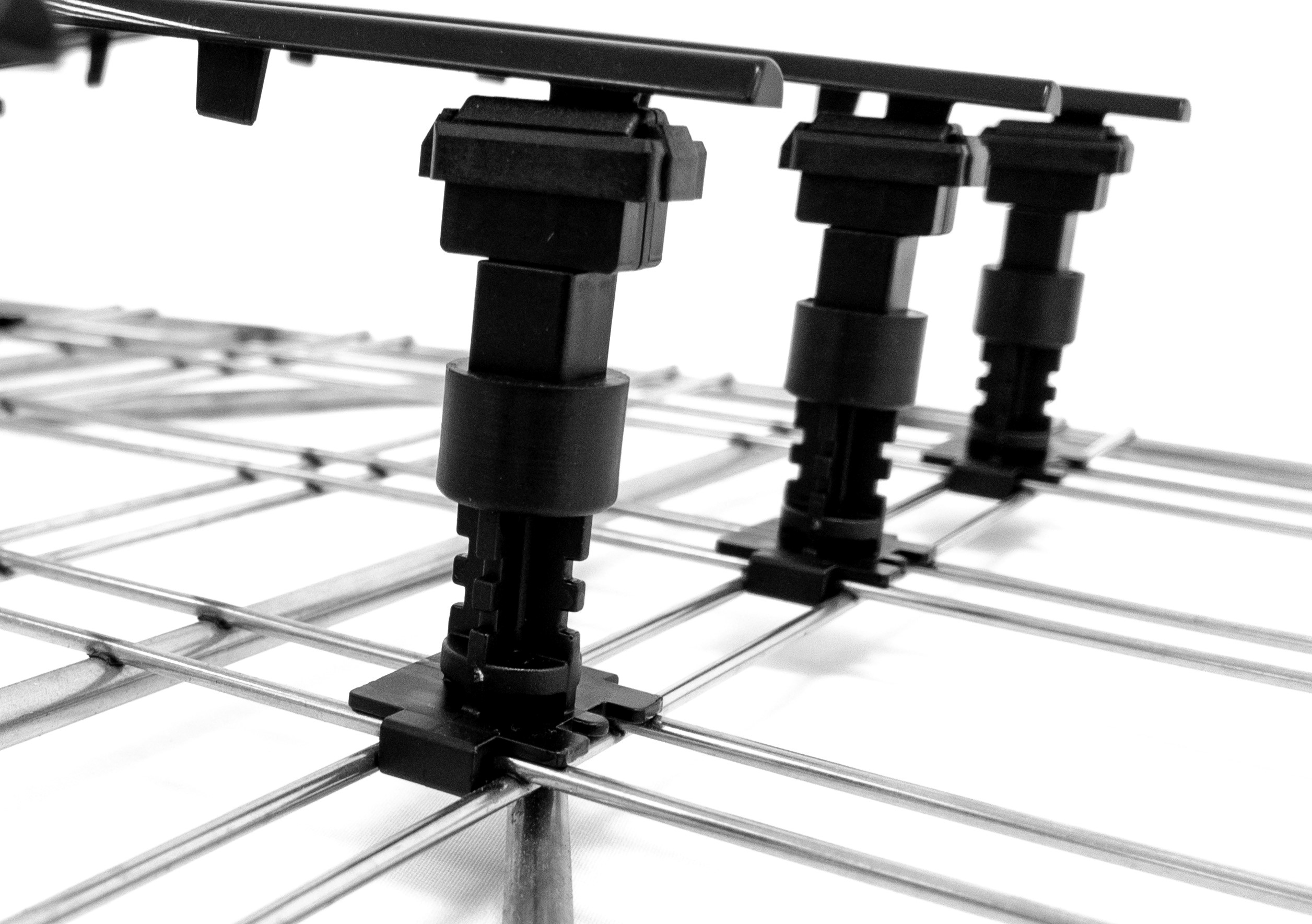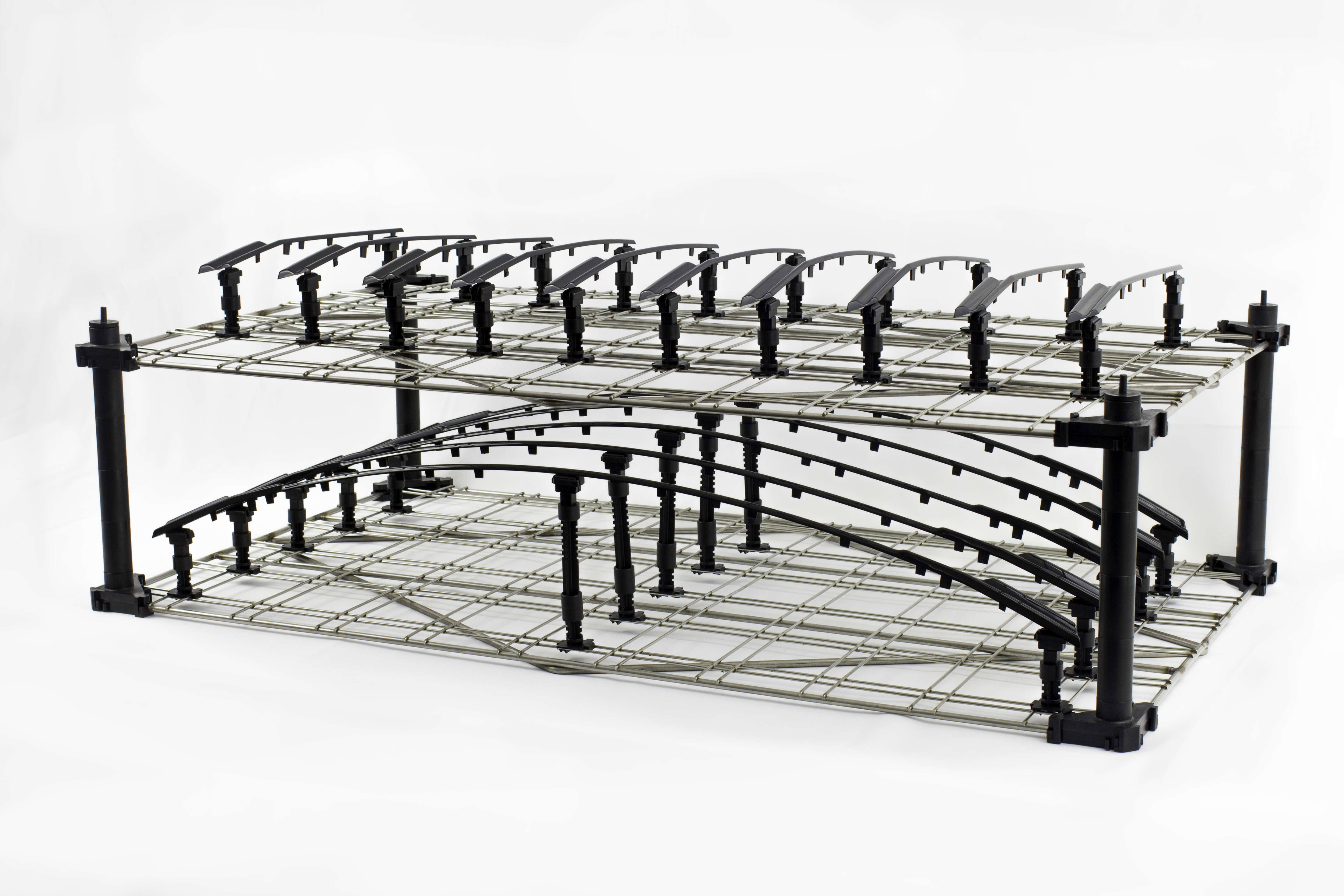 Custom-made product carriers for flatbed and robotic painting systems. Hanging and horizontal.