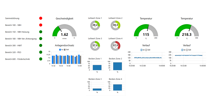 The AFOTEK Dashboard visualises relevant process data from coating lines. The status of the subsections as well as the associated process data are presented clearly and in real time.