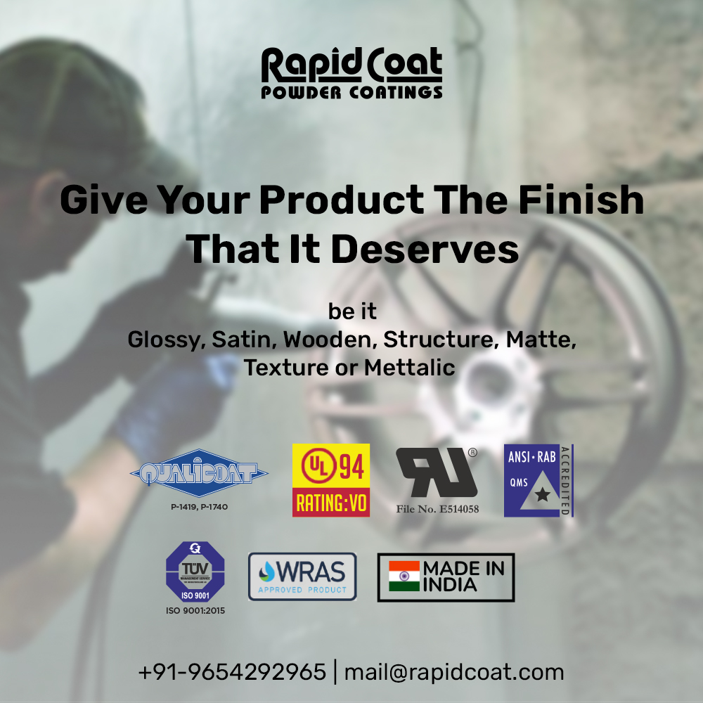 Rapid Coat offers a wide range of finishes including Glossy, Satin, Wooden, Structure, Matte, Texture, and Metallic Powder Coatings, designed to enhance both aesthetics and performance. Whether the requirement is a sleek high-gloss look, a subtle satin touch, a natural wooden effect, or a bold metallic finish, Rapid Coat provides solutions tailored to diverse industrial applications.