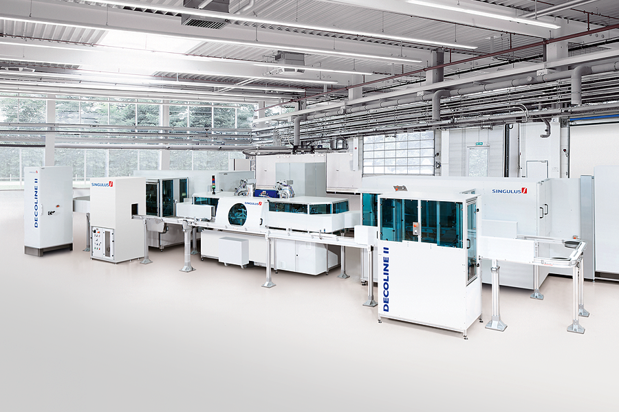 The DECOLINE II by SINGULUS TECHNOLOGIES is a turnkey production system designed for pre cleaning, metallizing, and lacquering of 3D parts. The green metallizing inline system seamlessly integrates vacuum metallization (cathode sputtering) with all coating. lacquering and pre-processing steps into a single, fully automated production run.